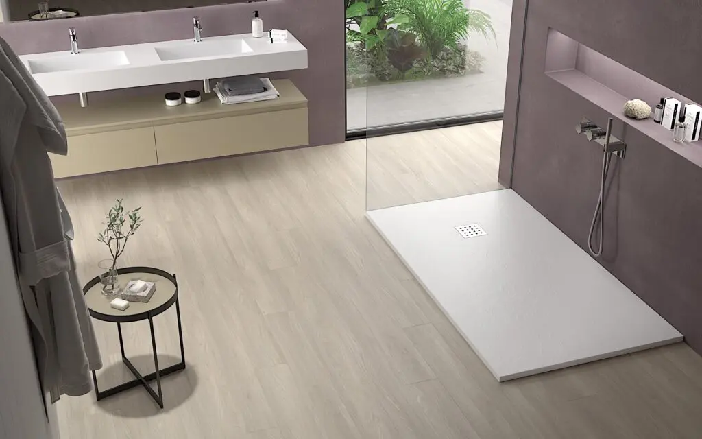 Platos de ducha antideslizantes – e resina con carga mineral. Este tipo de plato de ducha destaca por su durabilidad y resistencia.